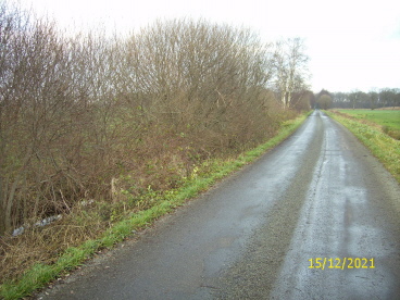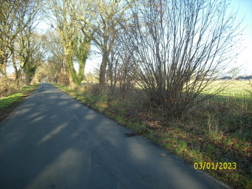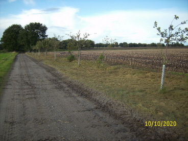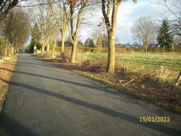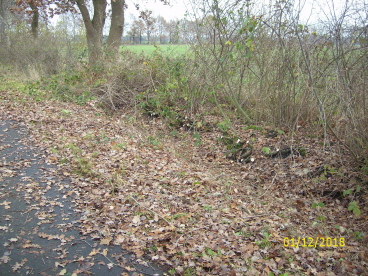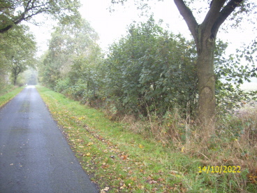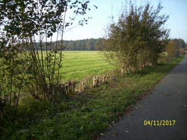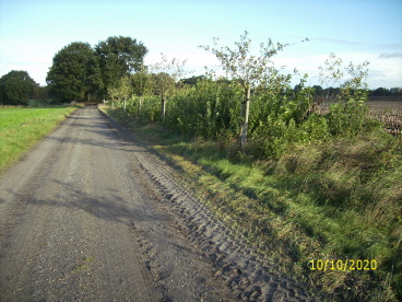 | Im Weg 3 (Verlängerung der Geestestraße) wurden Bereichsweise Sträucher wie Haselnuss, Schlehe und Weißdorn auf den Stock gesetzt. Von den Linden auf der anderen Straßenseite wurden die untersten Äste entfernt. Einige Tage später wurde der Grünstreifen zwischen Hecke und Fahrbahn von den Bauhofmitarbeitern der Gemeinde gemulcht. |