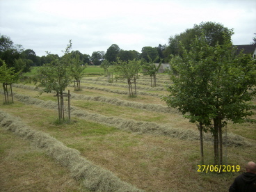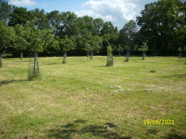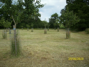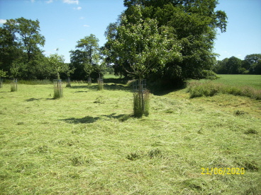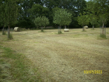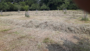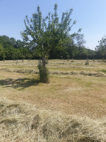 Am 27.06. wurde unsere Streuobstwiese mit Balkenmäher und Freischneidern gemäht. An den Folgetagen wurde das Gras täglich gewendet, sodass am 04.07. das Heu zu 5 Rundballen gepresst werden konnte. Am 15.07. haben wir die Grasnarbe unter einigen Obstbäumen abgetragen und das Loch mit Schreddergut aufgefüllt, damit in Zukunft das mähen der Fläche einfacher wird. Trotz Regenwetter haben wir 13 Bäume geschafft. Bei gutem Wetter haben wir am 22.07. die Baumscheiben der restlichen Obstbäume vom Bewuchs befreit und mit Schreddergut gemulcht. Der Aushub wurde teilweise zu einem Erdhügel aufgeschüttet, der Rest wird zum auffüllen einer alten Fahrspur genutzt. Die übrig gebliebenen Hackschnitzel wurden auf den Zugangsweg aufgebracht. |