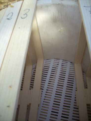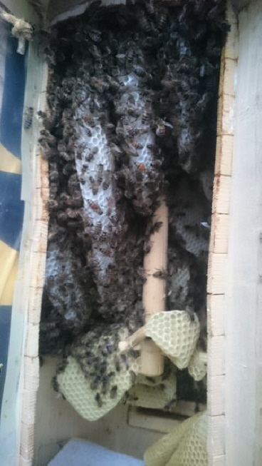 | In den ersten Tagen nach dem Einsetzen des Volkes war uns aufgefallen, dass eine Hilfswabe vom Rahmen gerutscht war. Diese wurde Ende Juni entfernt. Zur Zeit sind die Bienen fleißig am bauen und tragen reichlich Pollen in die Klotzbeute. |