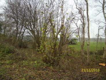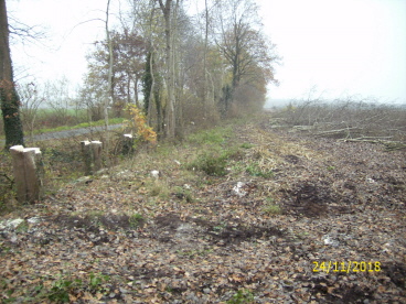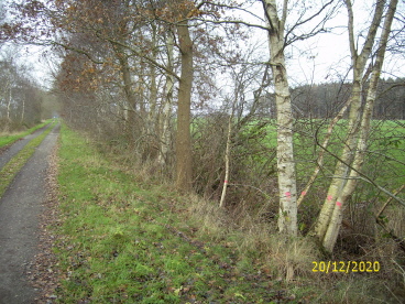 Im nördlichen Gehölzstreifen vom Weg 59 wurden einige Pappeln, Birken und Eichen gefällt. Weiterhin wurde eine Vielzahl von jungen Pappeln sowie Amerikanische Traubenkirschen entfert und div. Sträucher wie Öhrschenweide und Holunder auf den Stock gesetzt. Eine große Pappel wurde in ca. 4 m gekappt und bleibt als "Efeubaum" stehen. |