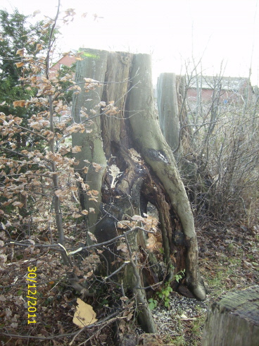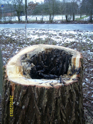 Im Bild ist der untere Teil des beschädigten Stammes zu sehen. Die Standsicherheit war nicht mehr gegeben, deshalb dieser starke Rückschnitt. |