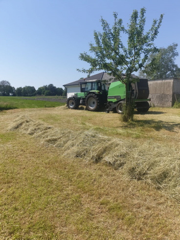 | Am 20.06. haben wir unsere Streuobstwiese mit Heckmähwerk und Freischneidern gemäht. An den Folgetagen wurde das Gras mehrfach gewendet und schließlich am 25.06. zu 200 kleinen Heuballen gepreßt. |