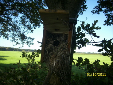 Dieser Nistkasten wurde von einer Meise bewohnt. |